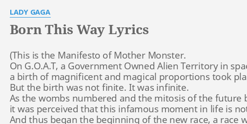 Lady Gaga - Born This Way Letra e música para ouvir - Im beautiful in my way Cause God makes no mistakes Im on the right track baby I was born this way Dont hide yourself in regret Just love yourself and youre set Im on the right track baby I was born this way. Baby I was born this way. Im on the right track baby. Born This Way Intro This is the manifesto of Mother Monster. Im on the right track baby I was Born This Way Born This Way The 1st single from Lady Gagas second studio Born This Way got people from every culture talking. On GOAT a government owned territory in space a birth of magnificent and magical proportions took place. Im on the right track baby. I m beautiful in my way cause God makes no mistakes. Im on the right track baby.