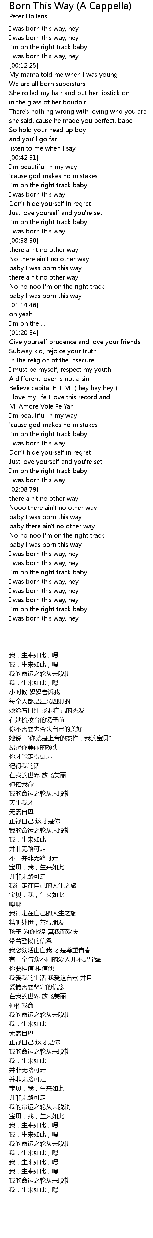 Im on the right track baby I was born this way Dont hide yourself in regret Just love yourself and youre set Im on the right track baby I was born this way Ooou there aint no other way Baby I was born this way Baby I was born this way Born this way Ooou there aint no other way Baby I was born this way Im on the right track baby I was. Everyone did such an amzing job every part is freaking amazing.